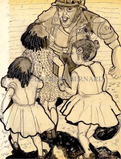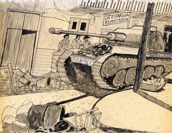 9. "Bombas Extrangeras" 11 x 14 ink on aged album paper with glue